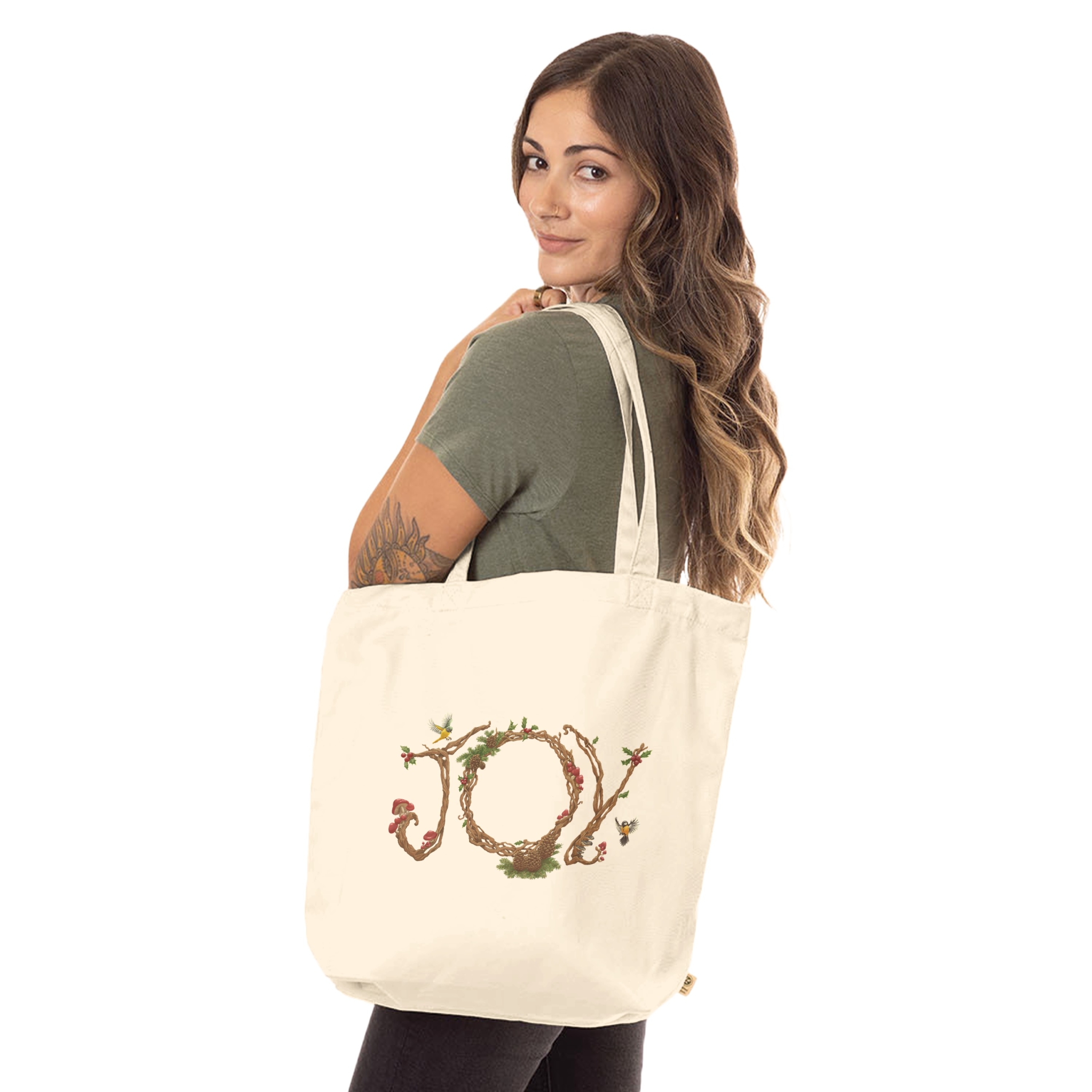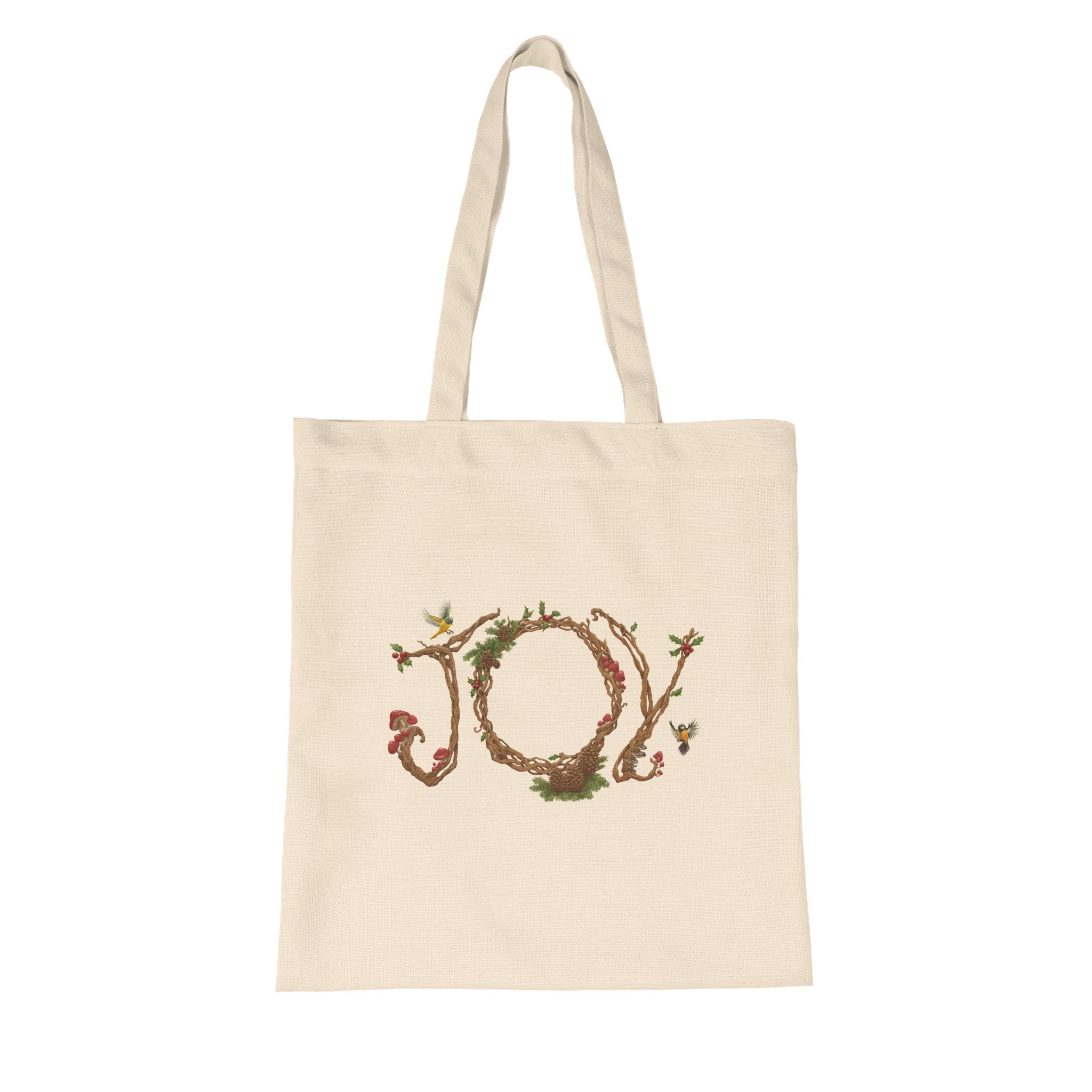 Illustrated word Joy with natural motifs printed on an eco-friendly tote bag. Perfect for daily use and environmentally conscious consumers.